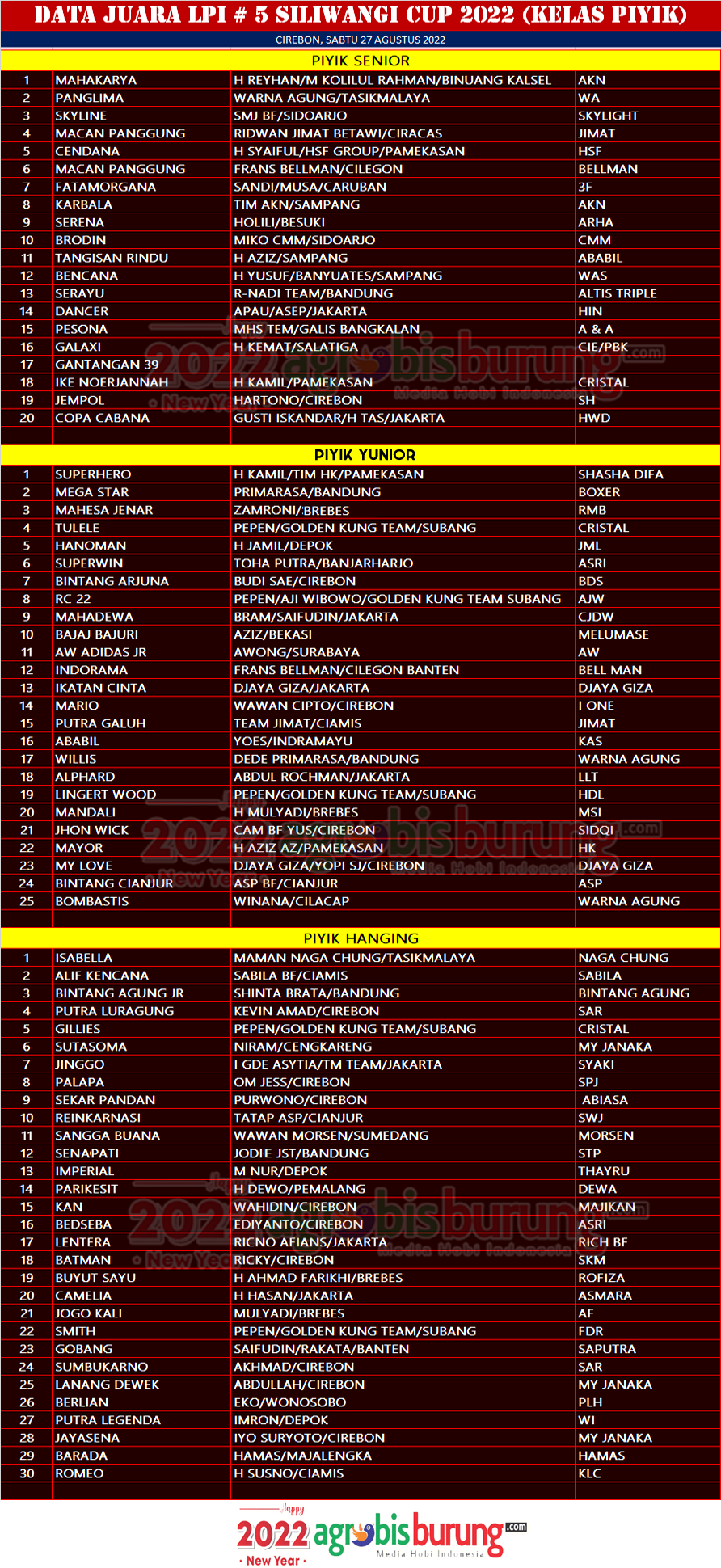 Data Juara LPI # 5 Siliwangi Cup 2022 di Cirebon, Sabtu 27 Agustus (Kelas Piyik)
