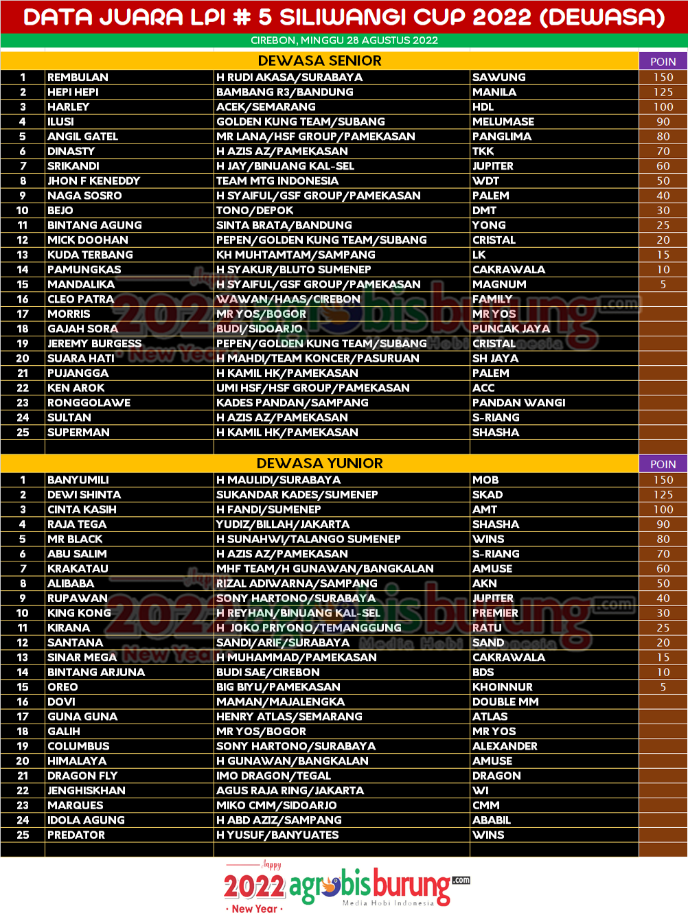 CIREBON, agrobisburung.com –  Data Juara Konkurs LPI # 5 Siliwangi Cup 2022 di Cirebon, Minggu 28 Agustus (KELAS DEWASA)