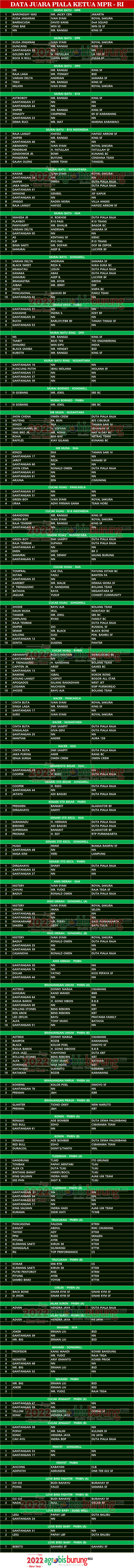 Headline Hobi Burung Juara Kicauan Kicauan Organizer Profil Data Juara Piala Ketua MPR RI di Senayan Jakarta , Minggu 28 Agustus agrobisburung 29 Agustus 2022 Data Juara Piala Ketua MPR RI di Senayan Jakarta , Minggu 28 Agustus Tinggalkan Komentar JAKARTA, agrobisburung.com – Data Juara Piala Ketua MPR RI di Senayan Jakarta , Minggu 28 Agustus Tinggalkan Komentar Post navigation Previous: Bersama Morris Siap Melejit, Mr Yos Kibarkan bendara breeding bersama trah istimewa plus 5 lantai kandang ternakNext: MB Kuda Jingkrak Nyaris Double Winner, AM Mistery Tak Terbendung DI Piala Ketua MPR DI Jakarta More Stories Headline Perkutut Profil WAT BF Tasikmalaya Rilis 69 Kandang Terbaru, “Final Update Season Imlek-Awal Puasa 2026” & Gelar Promo Spesial Selama Sepekan agrobisburung 18 Februari 2026 Headline Perkutut Profil Nurul Dewi Anggun BF Tamberu Sampang Terus berburu Jagoan Lomba & Kembali Taker Over Jawara LPI Diamond (AKS) Dari Masday Dengan Harga Super Fantastik agrobisburung 17 Februari 2026 Headline Perkutut Profil Hendry Kembali Rombak 25% Formasi Kandang WAT BF Tasikmalaya, Pramando BSD Booking Semua Kandang dengan Nilai Transaksi Spektakuler agrobisburung 17 Februari 2026