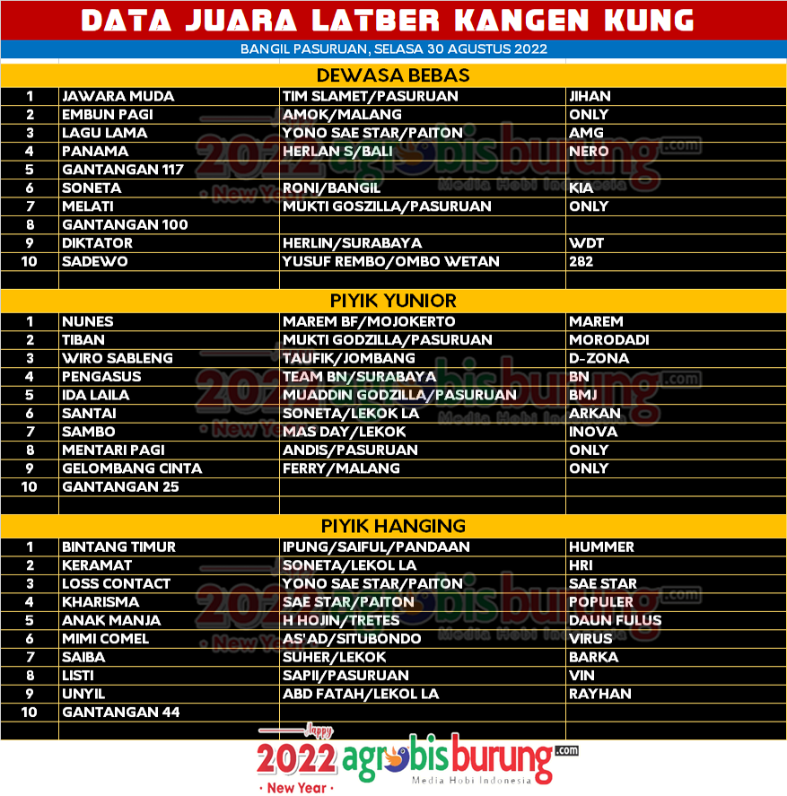 Di kelas piyik yunior, debutan anyar obritan Marem Mojokerto bernama Nunes yang tandang ke Bangil sukses mengemas kemenangannya dan ini menjadi jawara yang dikawal Taufik ini bisa memberikan bukti bahwa produk Maren juga bisa naik podium pertama. Tiban bergelang Morodadi dan Wiro Sableng bergelang D-Zona menyusul di posisi kedua dan ketiga. Di kelas piyik hangin debutan muda bernama Bintang Timur bergelang Hummer menjadi yang terhebat di kelasnya dengan naik podium pertama mengeser lawan lawannya. AB-END