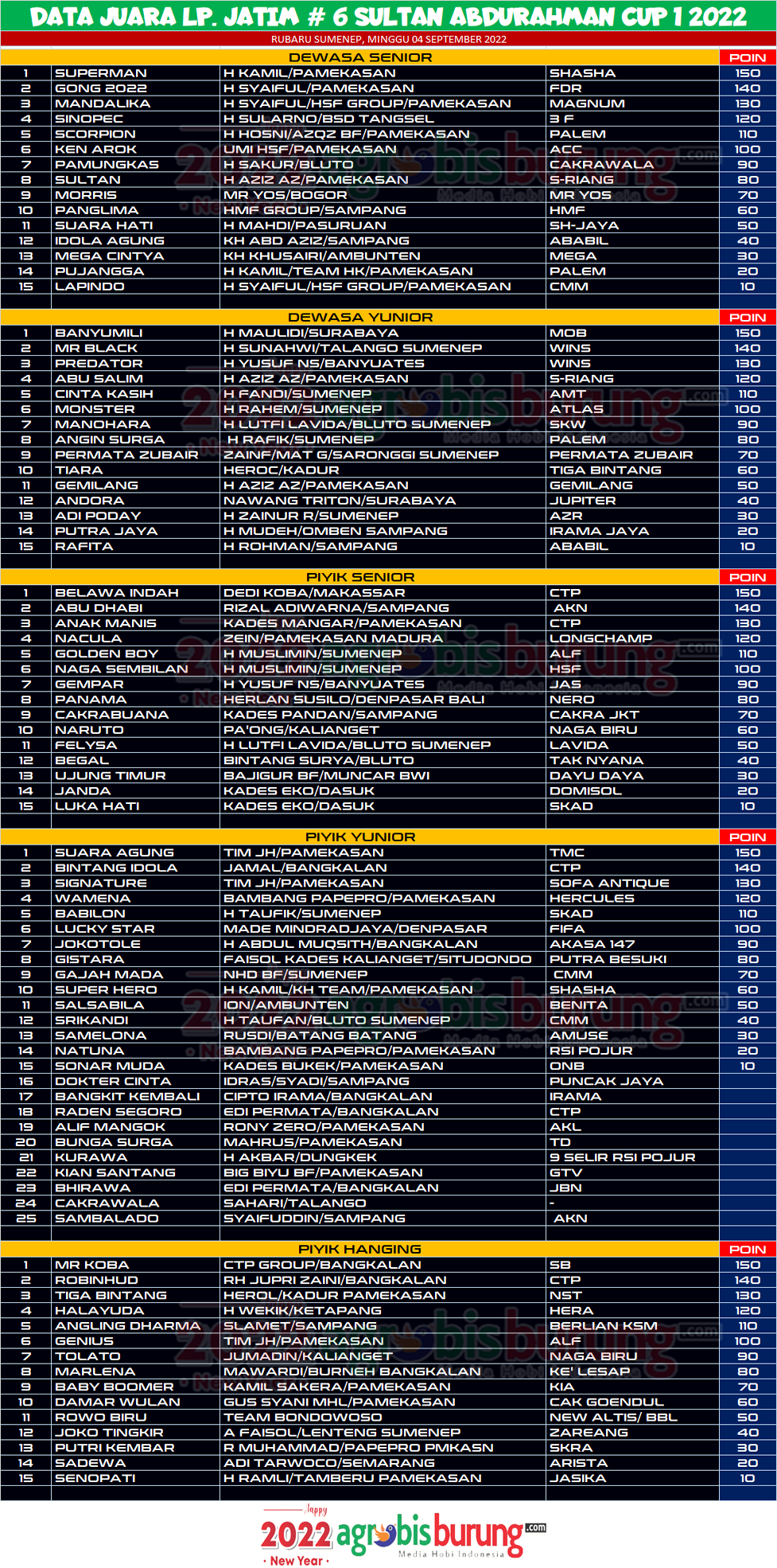 Data Juara LP. Jatim # 6 Sultan Abdurahman Cup 1 2022 di Sumenep, Minggu 04 September