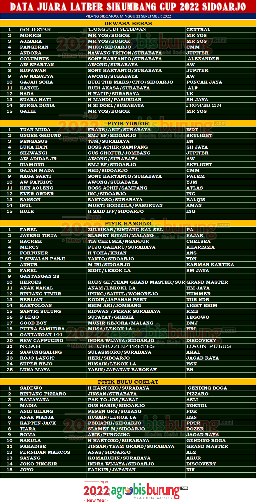 Headline Hobi Burung Juara Organizer Perkutut Perkutut Profil Tokoh Data Juara Latber Sikumbang Cup 2022 di Sidoarjo, Minggu 11 September agrobisburung 11 September 2022 Data Juara Latber Sikumbang Cup 2022 di Sidoarjo, Minggu 11 September Tinggalkan Komentar SIDOARJO, agrobisburung.com – Data Juara Latber Sikumbang Cup 2022 di Sidoarjo, Minggu 11 September Tinggalkan Komentar Post navigation Previous: Longkung Coy, Tobelo & Monaco Beraksi keren di gelaran KPU Jayakarta Cup 2022 di Jakarta UtaraNext: Data Juara Papepro Kades Cup 2022 Tlangoh Propo Pamekasan, Minggu 11 September More Stories Headline Perkutut Profil Pramando Jakarta Penghobi Pemula Pemberani, Siapkan Amunisi Lomba dengan Memborong Produk Terkini WAT BF Tasikmalaya Plus Booking Kandang WAT Slipknot & WAT Revolusi agrobisburung 20 November 2025 Headline Juara Perkutut Tetap Semangat Ke Lapangan, Jawara Champion & Galih Jati Bikin Kejutan Di Latihan Dinilai Rabuan Marina Semarang agrobisburung 20 November 2025 Headline Hobi Lain Perkutut Profil Jawara Ruby Star Ikon Prima Rasa Team Bandung, Selama 2,5 Tahun Eksis di Papan Atas & Sudah Menjajal Semua Gelaran Lintas Blok agrobisburung 19 November 2025