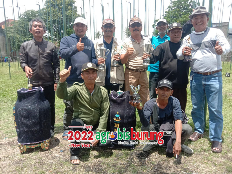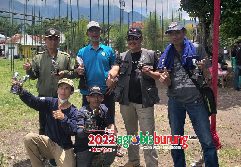 H. Ridwan RMP (ketiga kiri) bersama Soreang Team, sukses antarkan Bharada juara dewasa bebas.Hendrik Mix (jongkok), sukses antarkan Sarimanis juara piyik yunior.