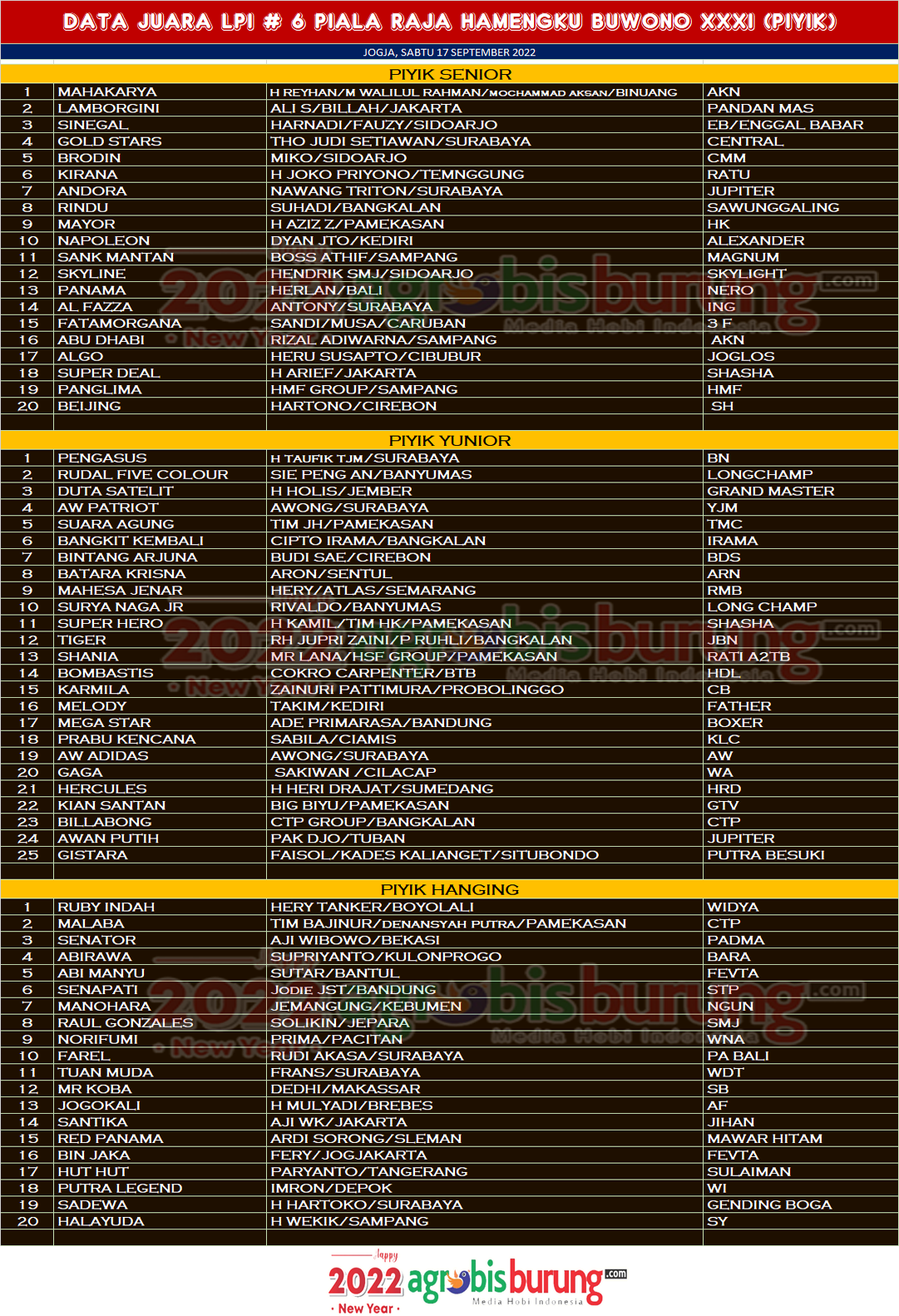 JOGJA, agrobisburung.com – Data Juara LPI # 6 Piala Raja Hamengku Buwono XXI 2022 Di Jogja, Sabtu 17 September