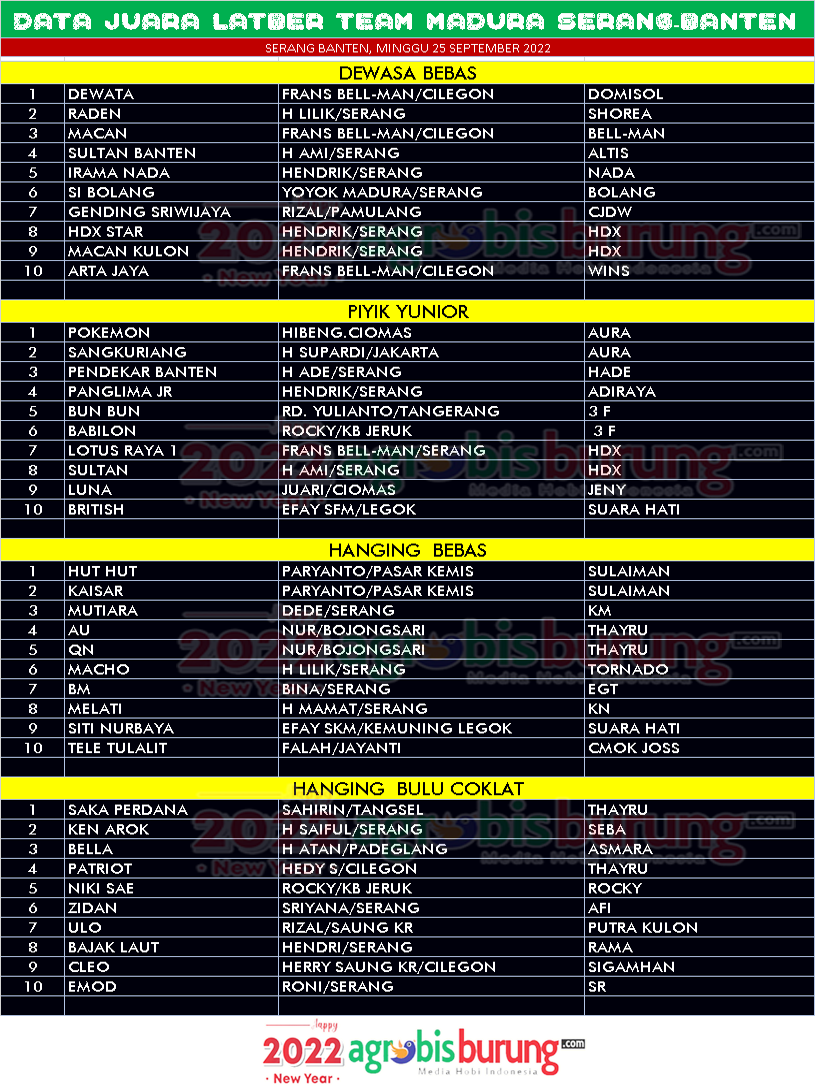 Di piyik yunior, Pokemon begelang Aura milik Hiben/Ciomas merebut posisi pertama bersama produk aura lainnya Sangkuriang diposisi kedua dan Pendekar Banteng bergelang Hade merebu posisi ketiga. Di kelas hanging bebas, Dua jawara handal milik Paryanto Pasar Kemis Serang bernama Hut Hut dan Kaisar yang sma sama bergelang Sulaiamn merebut podisi pertama dan kedua.