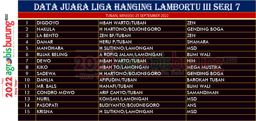 TUBAN, agrobisburung.com – Seri lanjutan Liga Hanging Lambortu III seri 7 tahun 2022 diguirkan di Tuban pada Minggu (25/09) dan kungmania yang masuk dalam paguyuban Lambortu juga hadir meramaikan lomba. Dan Kali ini yang menjadi terbaik pertama adalah Digdoyo bergelang ZEN milik Mbah Warto Tuban, disusul Nakula bergelang Gending Boga di urutan kedua yang bersaing ketat memperebutkan posisi pertama dan La Bento bergelang ZEN di posisi ketiga. AB-ERI/end