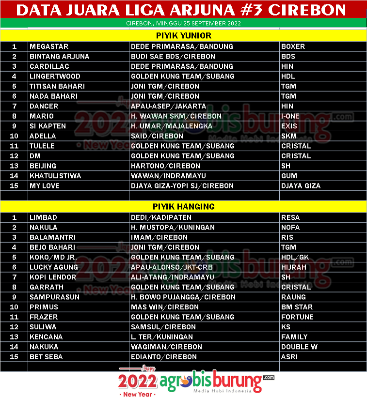 Pada gelaran kali ini Mega Star mewakili tim tamu dari Bandung berhasil meraih juara pertama di kelas piyik yunior. Burung milik Dede Primarasa Bandung yang dikawal Roy Fajri Sumedang ini tampil meyakinkan dan mampu melewati ketatanya persaingan di kelas kerekan setengah tiang. Posisi kedua ditempati Bintang Arjuna milik Budi Sae BDS, salah satu andalan tuan rumah yang sama-sama sudah menjajal kerasnya persaingan di tingkat nasional. Sedangkan posisi ketiga ditempati andalan Dede Primarasa lainnya, yakni Cardillac.