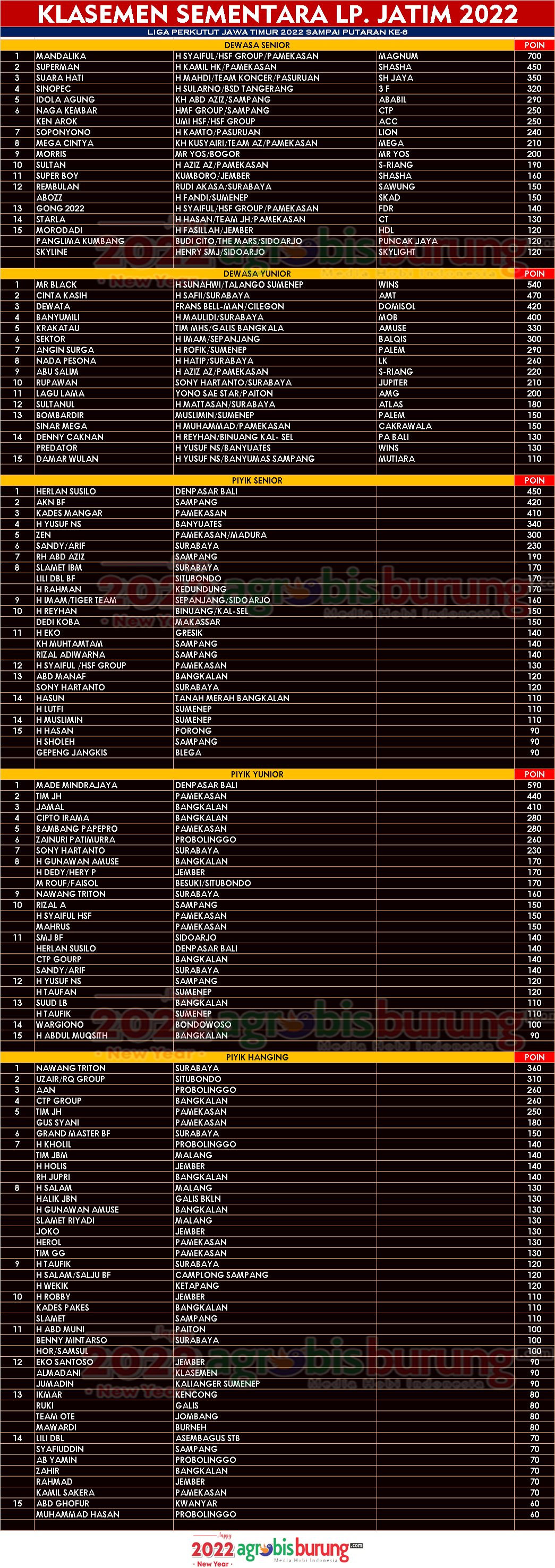 Update Klasemen Sementara LP. Jatim 2022 # 6, Mandalika Kokoh, Mr Black & Herlan Nero rebut posisi 1, Mindra & Nawang Kuasai piyik yunior dan Hanging