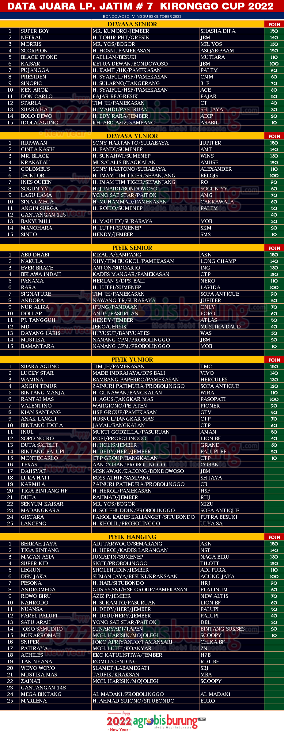 Dan di kelas piyik senior, Abu Dhabi bergelang AKN milik Rizal Adiwarna Sampang menjadi terbaik pertama di kelasnya serta di kelas piyik yunior dan piyik hanging dua debutan anyar Suara Agung bergelang TMC milik Tim JH Pamekasan menjadi yang terbaik pertama di kelas piyik yunior dan Berkah Jaya bergelang SKN milik Adi Tarwoco Semarang menjadi yang terbaik pertama di kelas piyik hanging. AB-AIN/END