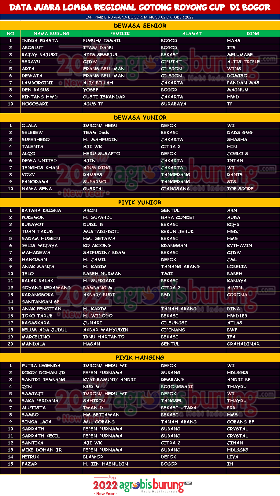 Di kelas piyik hanging, Putra Legenda bergelang WI milik Imron/Heru WI bersama Dohan JR/Koko bergelang HDL/GKS serta Santri Rembang bergelang ndri berbagi kemenangan diposisi pertama, kedua dan ketiga.  AB-ITA/END