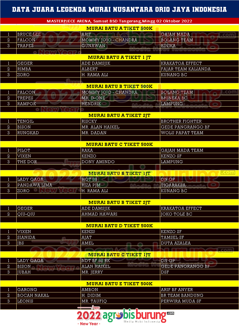 Data Juara Legenda Murai Nusantara Oriq Jaya Indonesia di Masterpiece Arena BSD, Minggu 02 Oktober