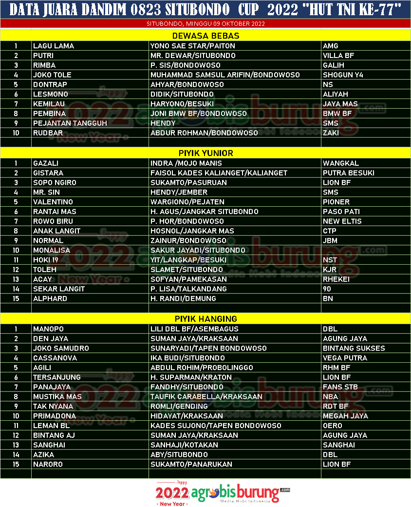 SITUBONDO, agrobisburung.com – Gelaran Dandim 0823 Situbondo Cup 2022 pada Minggu (09/10) mnejadi ajang yag menarik untuk kiprah jawara jawara terbaik di blok Timur Pantura dan ini jelas memperlihatkan peta kekuata jawara di blok timur merata dan ini dipertontonkan para jawara yang turun di beberapa lomba di blok timur, termasuk di Situbondo. Basuki, ketua pengda Situbondo mengaatkan bahwa gelaran Dandim Cup 2022 menjadi ajang lanjutan setelah Bupati Cup Situbondo dan antusias kungmania untuk meramaikannya sama besarnya. “Kami atas nama pengda Situbondo mengucapkan terima kasih atas kehadirannya di Situbondo dan selamat kepada para pemenang lomba,” ucap Basuki.