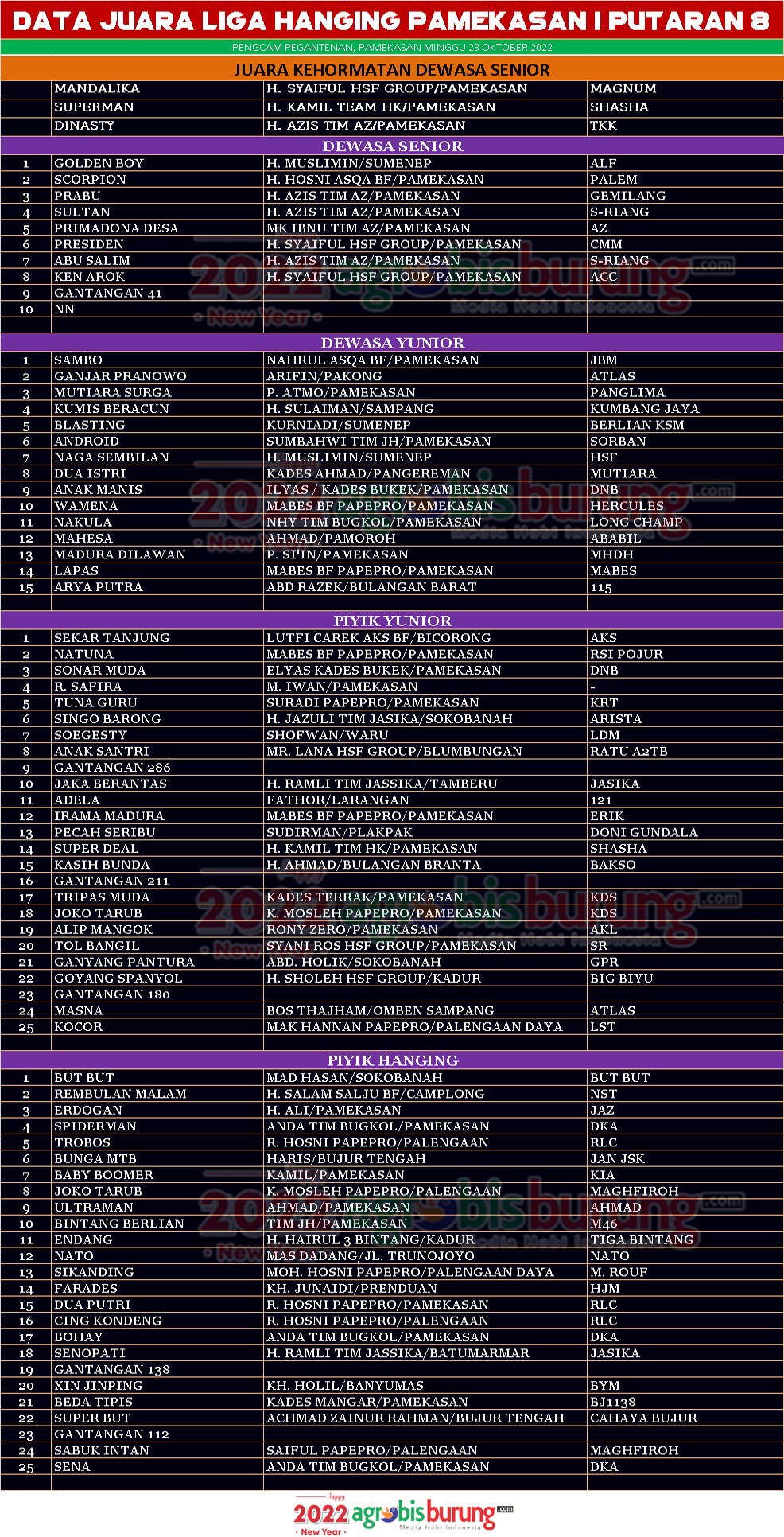 Seperti yang sudah berjalan bahwa untuk burung burung nasional yang ikut turun di kelas yang dimainkan di Liga Hanging Pamekasan akan diberikan juara kehormatan dan kali ini Mandalika, Superman & Dinasty adalah pemenang kehormatan di dewasa senior. Sementara Golden Boy bergelang ALF milik H Muslimin Sumenep nampaknya semakin meningkat peforma tarungnya dan mampu mengalahkan  Scorpion bergelang Palem dan Prabu bergelang Gemilang yang bertengger di posisi kedua dan ketiga.