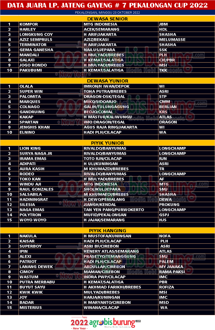 Dan juara terbaik pertama di kelas piyik hanging adalah Nakula bergelang Nova milik H Mustofa Kuningan yang kali ini benar benar angunnya membuat juri memberikan nilai terbaik untuk naik di podium pertama. Kaisar bergelang PLH dan Superboy bergelang Asri yang juga apik tampilannya harus puas di peringkat kedua dan ketiga. AB-EDO/end