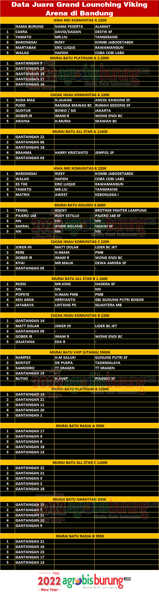 Headline Hobi Burung Juara Kicauan Kicauan Organizer Profil Data Juara Grand Lounching Viking Arena di Bandung, Minggu 23 Oktober agrobisburung 25 Oktober 2022 Data Juara Grand Lounching Viking Arena di Bandung, Minggu 23 Oktober Tinggalkan Komentar BANDUNG, agrobisburung.com – Data Juara Grand Lounching Viking Arena di Bandung, Minggu 23 Oktober Tinggalkan Komentar Post navigation Previous: Tampil Mewah MB Tengil Raih Double Winner Di Grand Launching Viking Arena BandungNext: MB Kawaguci Jr Duo Dan Kawaguci Jr 13 Unjuk Prestasi Di Grand Launching Viking Arena Bandung More Stories Headline Perkutut Profil Hendry Sobbandi : “Pemula Perkutut Tak Perlu Bingung dalam Memilih Burung Berkualitas, Fokus Saja pada Karakter Suara !” agrobisburung 27 Februari 2026 Headline Juara Perkutut WAT BF Tasikmalaya “Upgrade” Formasi Kandang Secara Berkala untuk Tingkatkan Kualitas Produksi, Daftar Bookingan Merata & Stok Anakan Selalu “Sold Out” agrobisburung 25 Februari 2026 Headline Organizer Perkutut Hasil Musda Jombang 2026, Agung Hariadi Terpilih Jadi Ketua Baru Pengda Jombang Secara Aklamasi & Siap Lanjutkan Program Ketua Lama agrobisburung 20 Februari 2026