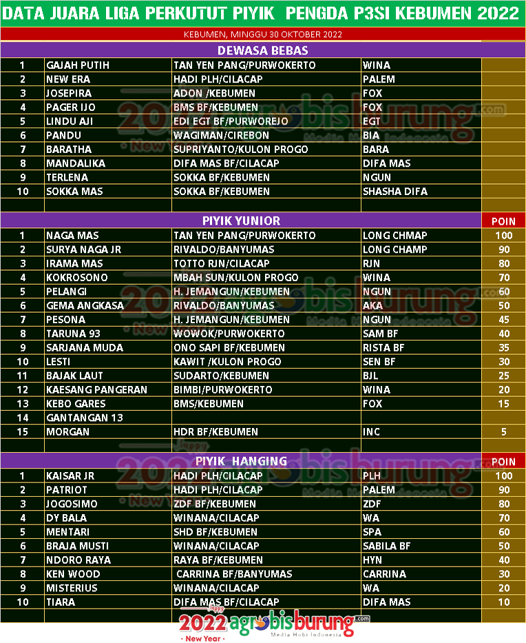 Dan jalannya liga sangat menarik, bahkan penguasan di tiga kelas yang dimainkan menjadi kekuasaan beberapa jawara yang memang sudah berpengalaman di lapangan, di dewasa bebasGajah PutihTan Yeng Pang dari Purwokerto bergelang Wina menjadi yang terbaik pertama di kelasnya. Di kelas piyik yunior, dua produk Longchamp Banyumas Naga Mas milik Tan Yeng Pang Purwokerto dan Surya Naga Jr milik Rivaldo menguasai dua besar kejuaraan. Di kelas piyik hanging, debutan belia dua jawara milik tim PHL Cilacap bernama Kaisar Jr & Patriot bertahta di podium pertama dan kedua. AB-END