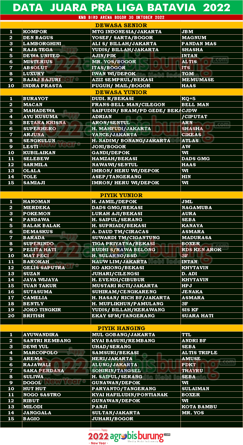 Sementara itu jalannya Liga menampilkan jawara jawara terbaik di masing masing kelas, di dewasa Senior juara pertamanya direbut Kompor milik H Gunawan MTG Indonesia, di dewasa yunior jawara Burayot bergelangKq+5 milik Dudi R Bekasi menjadi yang terhebat pertama di kelasnya. Dan di kelas piyik yunior posisi terbaik pertama ditempati Hanoman berglang JML milik H Jamil Depok serta Ayuwandira berglang TTL milik Mul Gobang Jakarta. AB-END