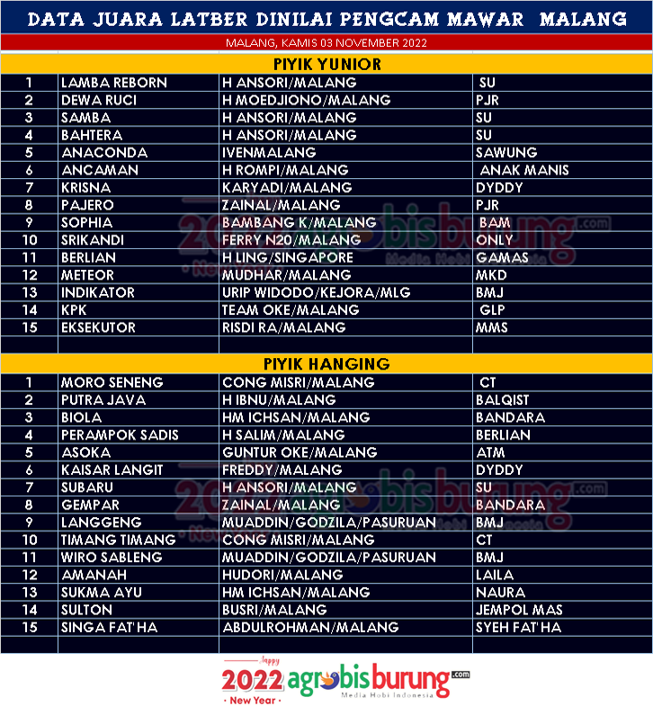Di kelas piyik yunior, Lamba Reborn bergelang SU milik H Ansori Malang menjadi yang terbaik pertama dan Moro Senang bergelang  CT Milik Cong Misri Malang menjadi yang terbaik pertama di kelas piyik hanging. AB-END