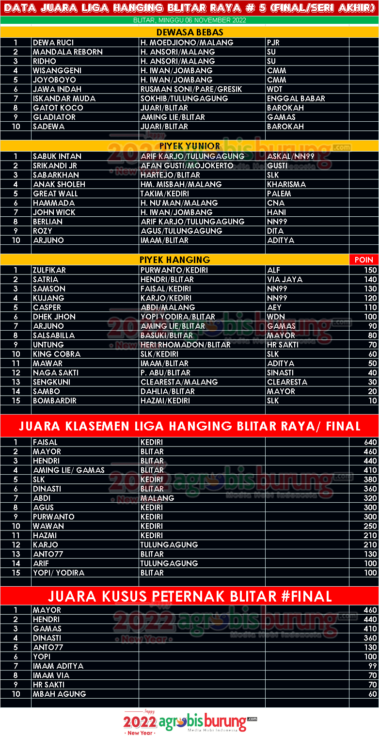 Faizal Kediri terbaik Liga, Mayor peternak terbaik , Dewa Ruci & Sabuk Inten Bersaing ketat di Seri akhir Liga Hanging Blitar 2022