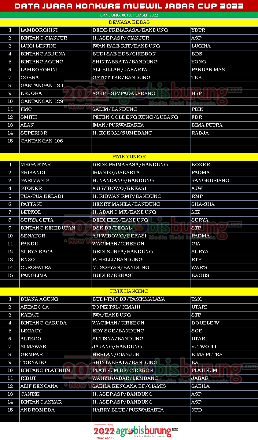 Di kelas piyik hanging, TMC BF kembali membuktikan diri sebagai salah satu peternak yang rajin menelorkan burung berbakat. Kali ini giliran Buana Agung yang dikawal Budi Artis Tasikmalaya, berhasil menguasai persaingan di kelas pemula ini. Posisi kedua ditempati Artaboga, orbitan anyar pemandu bakat milenial: Opik TSL. AB-AMAPenyerahan SK Perumus Pengda Bandung kepada Hendrik Mix (kanan).Dihadiri para tokoh perkutut Jabar.