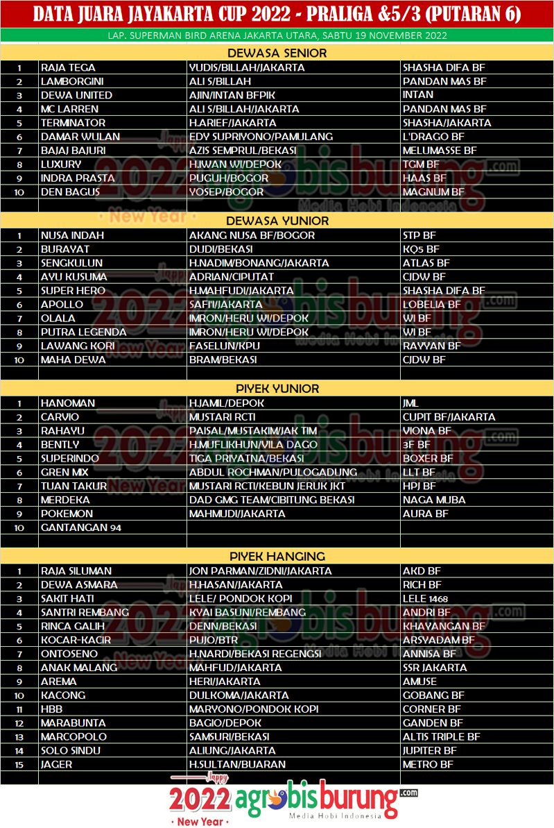 JAKARTA, agrobisburung.com – Gelaran Jayakarta Cup 2022 di lapangan Superman Bird Arena pada Sabtu (10/11) menjadi ajang seru di wilayah Jakarta Utara, pasalnya jogo jago terbaik di Sejabodetabek ikut mabil bagian gelaran tersebut. Di dewasa senior Raja tega bergelang Shasha milik Yudiz/Billah Jakarta tetap menjadi penguasa sejati setelah meredam gempuran Lamborgini bergelang Pandan Mas dan Dewa United bergelang Intan yang berada di posisi kedua dan ketiga. Di kelas dewasa yunior juara terbaik pertamanya nya di raih Nusa Indah bergelang STP milik Akang Nusa Bf Bogor .