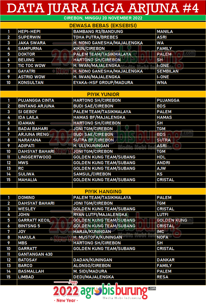 Headline Hobi Burung Juara Organizer Perkutut Perkutut Profil Data Juara Liga Arjuna # 4 Di Cirebon , Minggu 20 November agrobisburung 21 November 2022 CIREBON, agrobisburung.com – Data Juara Liga Arjuna # 4 Di Cirebon , Minggu 20 November Tinggalkan Komentar Post navigation Previous: Tak Kebagian Adik-adiknya, Santos BIG Bandung Jebol Indukan Bharada dari OH BF dengan Mahar IstimewaNext: Hepi-Hepi Jawara Eksibisi, Pujangga Cinta Ngorbit & Domino Dominan di Liga Arjuna #4 Cirebon More Stories Headline Perkutut Profil WAT BF Tasikmalaya Rilis 69 Kandang Terbaru, “Final Update Season Imlek-Awal Puasa 2026” & Gelar Promo Spesial Selama Sepekan agrobisburung 18 Februari 2026 Headline Perkutut Profil Nurul Dewi Anggun BF Tamberu Sampang Terus berburu Jagoan Lomba & Kembali Taker Over Jawara LPI Diamond (AKS) Dari Masday Dengan Harga Super Fantastik agrobisburung 17 Februari 2026 Headline Perkutut Profil Hendry Kembali Rombak 25% Formasi Kandang WAT BF Tasikmalaya, Pramando BSD Booking Semua Kandang dengan Nilai Transaksi Spektakuler agrobisburung 17 Februari 2026