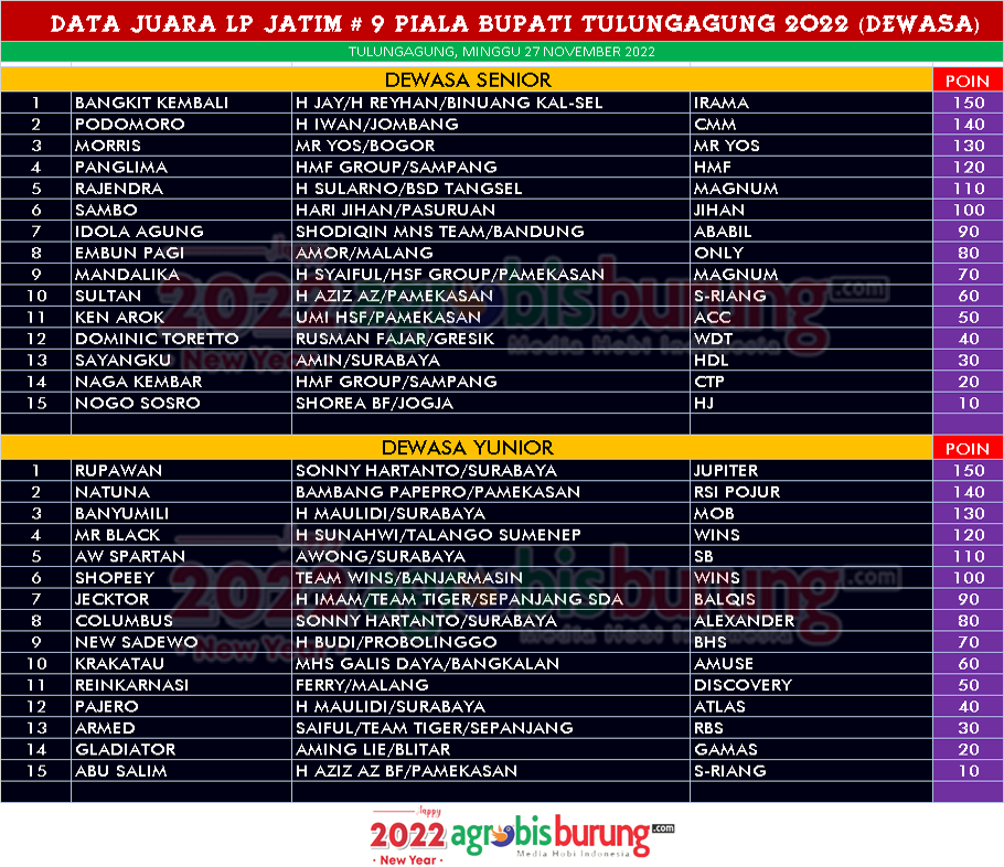 Di dewasa yunior, jawara Rupawan bergelang Jupiter juga mampu mencetak kemenangan beruntun di laga LP Jatim dan jawara milik Sony Hartanto ini di LP Jatim Piala Bupati Tulungagung kembali membuktikan kehebatannya merebut posisi pertama setelah mengunguli lawan lawanntya. Rupawan memang salah satu jawara di kelas dewasa yunior yang memiliki mental tarung yang stabil dan di setiap penampilannya selalu dibarengi dengan menyabet posisi pertama. Natuna bergelang RSI Pojur dan Banyumili bergelang MOB yang juga tamoil gemilang harus puas merebut posisi kedua dan ketiga.