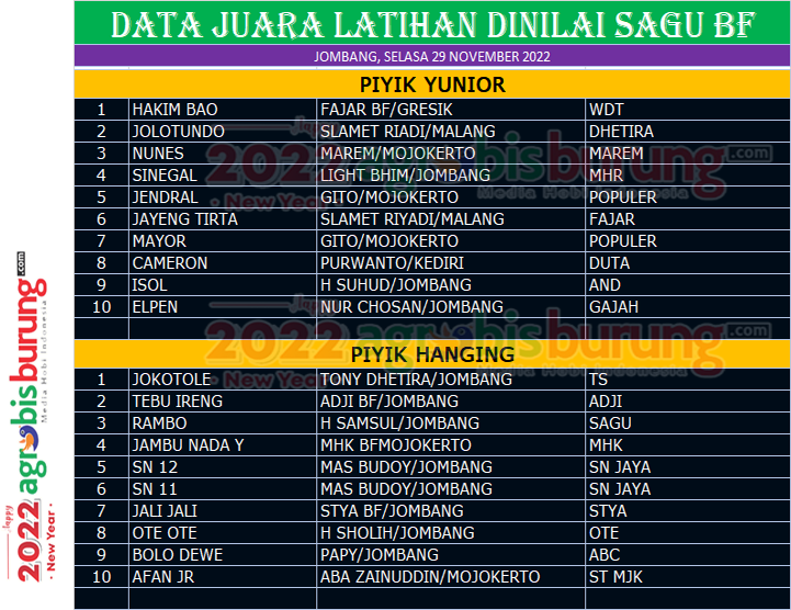 Di kelas piyik hanging, debutan belia Jokotole milik Tony Dhetira bergelang TS Jombang menjadi yang terbaik di kelas nya , Jokotole yang tampil apik mampu mengimbangi Tebu Ireng bergelang Adji dan Rambo bergelang Sagu yang akhirnya berada di posis kedua dan ketiga. AB-END