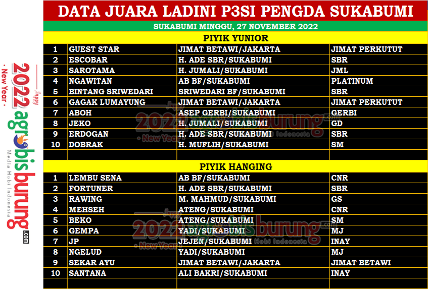 SUKABUMI, Agrobisburung.Com –Sebagai tim tamu, Jimat Betawi BF yang dimotori Ridwan Sebastian Jakarta, mampu menunjukkan eksistensinya di kandang lawan. Hadir dengan amunisi pilihan, Jimat Betawi tampil dominan pada gelaran Ladini P3SI Pengda Sukabumi, Minggu (27/11/22). Di kelas piyik yunior, Jimat Betawi sukses menempatkan dua andalannya, yakni debutan Guest Star (Jimat Perkutut) yang meraih juara pertama, kemudian andalan lawasnya Gagak Lumayung (Jimat Perkutut), yang menempati podium keenam. Guest Star usia 4 bulan (JP K.69) langsung turun di piyik yunior, baru diambil dari Jimat Perkutut seangkatan dengan Paparaca. Sedangkan Gagak Lumayung (JP K.111), kondisi kurang fit masih masuk ke-6. “Sementara Sekar Ayu produk sendiri (Jimat Betawi K.03: JP K.82 x Biola K.5),” ungkap Ridwan.