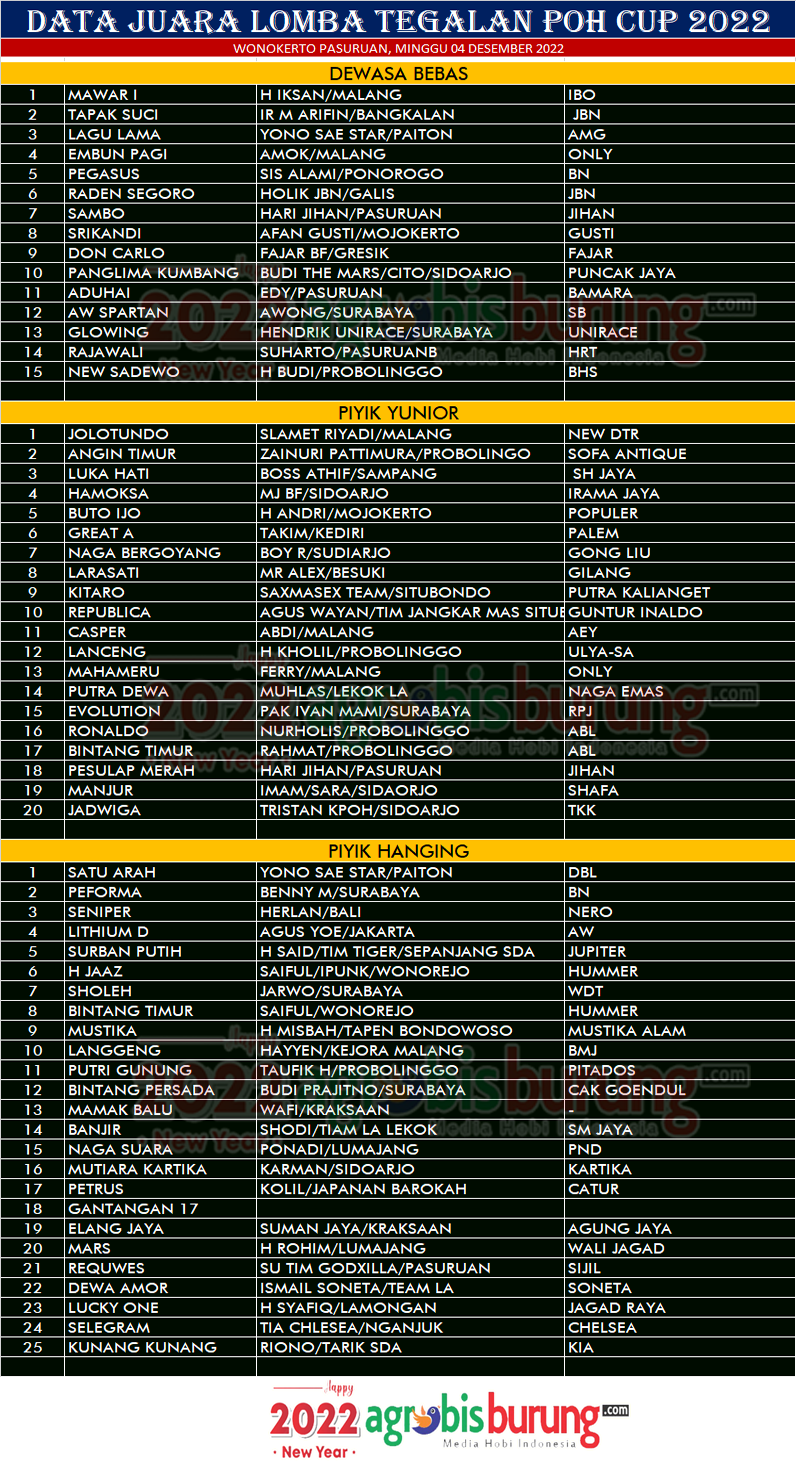 Di kelas piyik yunior juga terjadi kejutan, jawara bernama Jolotundo bergelang New DTR milik Slamet Riyadi Malang kembali menujukkan kelasnya untuk moncer di posis pertama. Jolotundo mampu mengatasi perlawanan sengit Angin Timur bergelang Sofa Antique dan Luka Hati bergelang SH Jaya  yang harus puas diposisi kedua dan ketiga.