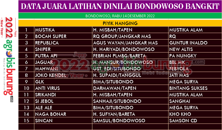 BONDOWOSO, agrobisburung.com – Gelaran latihan dinilai Bondowoso Bangkit yang di gelar di Bondowoso pada Rabu (14/12) menjadi ajang yang menarik kungmania Bondowos dan sekitarnya. Jago jago muda di seputaran kota Tape ini ikut meramaikan gelaran yang digelar pengda Bondowoso dan kali ini yang menjadi kapium juaranya adalah Mustika begelang Mustika Alam milik H Misbah yang mampu tampil energik untuk mengalahkan lawan lawannya. Bocah Super bergelang RQ dan Republica bergelang Guntur Inaldo yang juga bertarung sengit harus puas berada di posisi kedua dan ketiga.