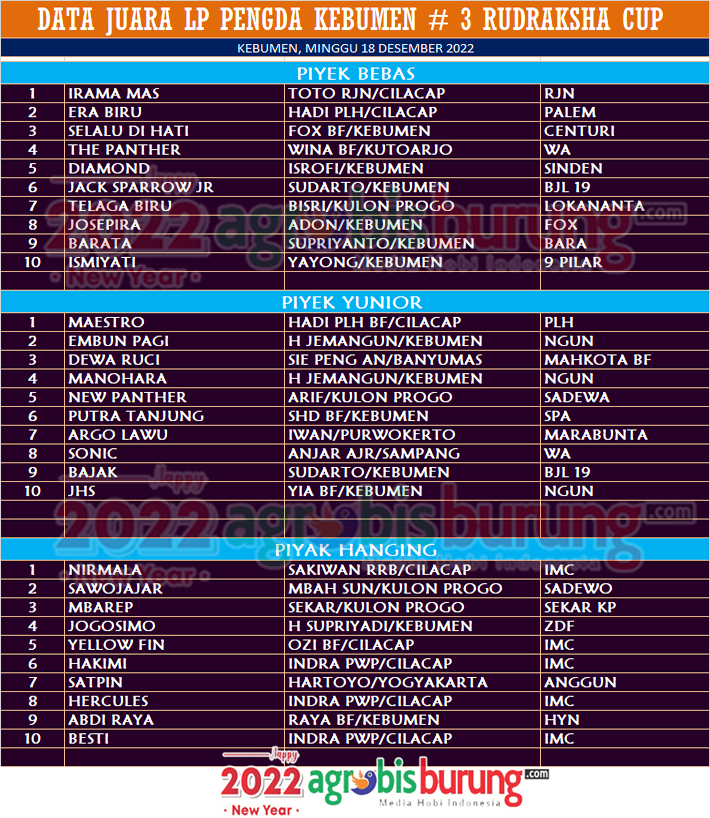 KEBUMEN, agrobisburung.com – Gelaran LPPK #3 (Liga Perkutut Piyik Kebumen) berlabel RUDRAKSHA CUP pada Minggu (18/12) berjalan lancar & sukses, antusias kung mania Kebumen, Cilacap, Banyumas,  Banjarnegara,  Purworejo bahkan dari Kulon Progo & DIY ikut meramaikan ajang ruti LPPK #3. Dan di gelaran tersebut dimainkan 3 blok kelas yang ludes terjual bahkan beberapa kungmania tak kebagian tiket namun mereka tetap antusias mengikuti lomba. Bahkan kelas baru piyik bebas yang sebelumnya tidk ada juga diserbu kungmania.