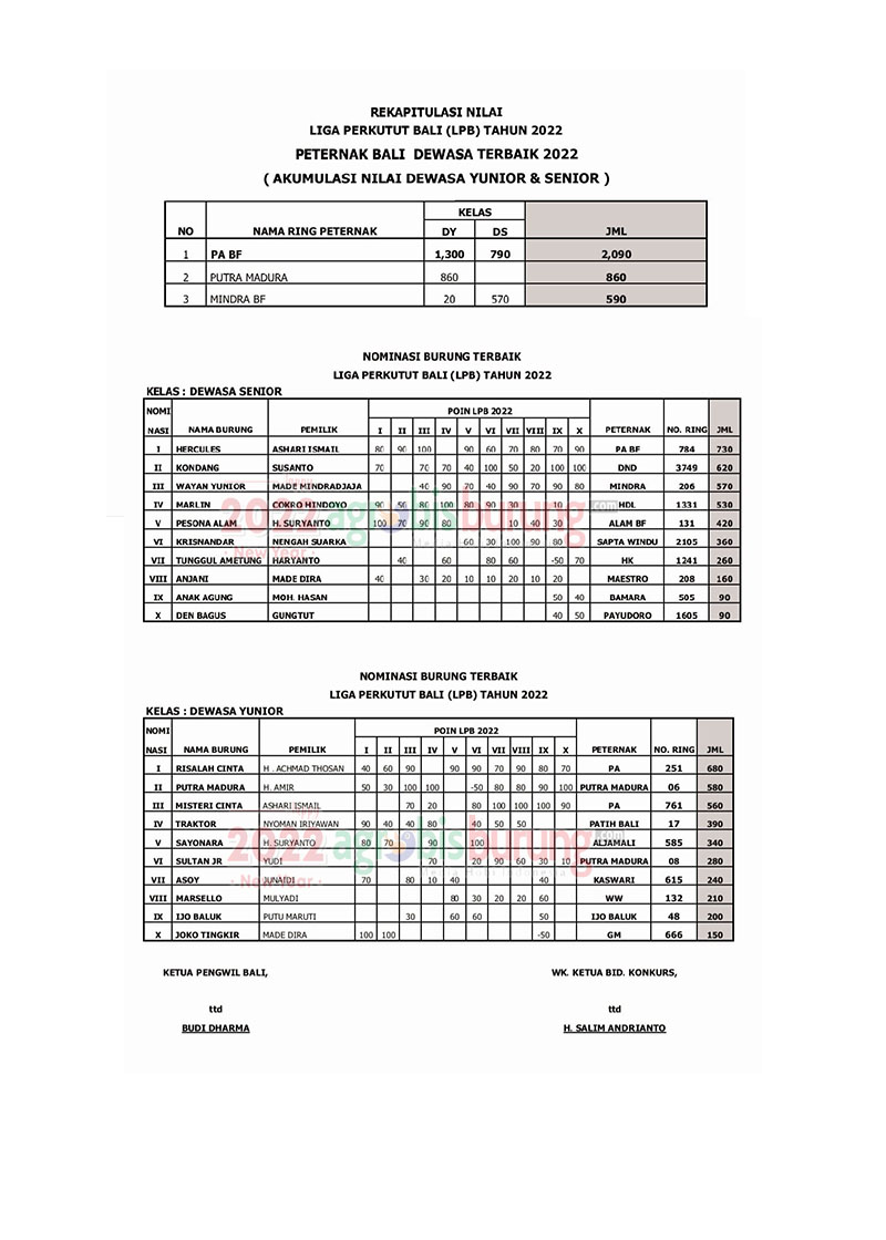 BALI, agrobisburung.com – Perhelatan Liga Perkutut Bali 2022 yang sudah digulirkan selama 1 tahun ini mengantarkan beberapa nominasi untuk Kungmania Bali baik itu burung terbaik di masing masing klasemen juga memberikan penghargaan nominasi kepada para peternak. PA BF milik A. Susanto yang selama beberapa tahun ini sangat konsisten mengembangkan trah trah terkini untuk breeding-nya mampu mencetak burung burung ciamik untuk lapangan. Dan salah satunya yang konsisten berprestasi di musim konkurs Liga Perkutut bali 2022. Sehingga diakhir LPB 2022 PA BF menjadi peternak terbaik karena konsistensinya melahirkan jawara jawara lomba selama LPB.