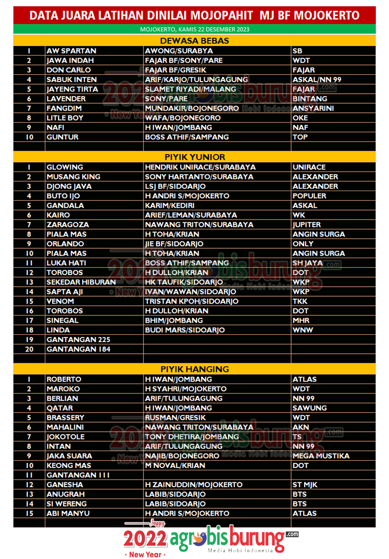 MOJOKERTO, agrobisburung.com – Latihan dinilai rutin di markas MJ (Mojopahit) BF Mojokerto pada Kamis (22/12) selalu menjadi ajang promosi jawara jawara baru untuk melatih mental tarungnya. H Andri MJ, pemilik lapangan permanen MJ Mojokerto mengatakan nantinya MJ Bird Arena ini akan dkembangkan untuk lomba dan saat ini kapasitas gantangan sudah mencapai 7 blok. Sehingga untuk tahun 2023 Insyaallah pengda Mojokerto ikut dalam gelaran LP. Jatim 2023. “Kami sangat berterima kasih kepada kung mania yang selalu rajin berbagung dengan kegiatan latihan dinilai MJ BF Mojokerto, Selamat kepada para pemenang,” ucap H Andri