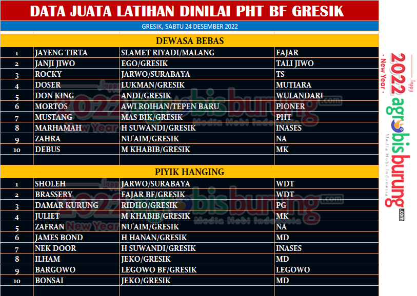 Dan juga dalam acara rutin ini juga dilakukan kopyok arisan kungmania Gresik yang dihadiri langsung H Tohir selaku tuan rumah , H Slamet Jawi Merbok serta kungmania lainnya yang menbuat acara yubub ini berjalan lancar dan sukses . Sementara hasil kejuaraan di latihan dinilai PHT, di Dewasa Bebas Jayeng Tirta bergelang Fajar melejit di dewasa bebas dan Sholeh bergelang WDT milik Jarwo Surabaya menjadi terbaik pertama di Piyik Hanging.  AB-END