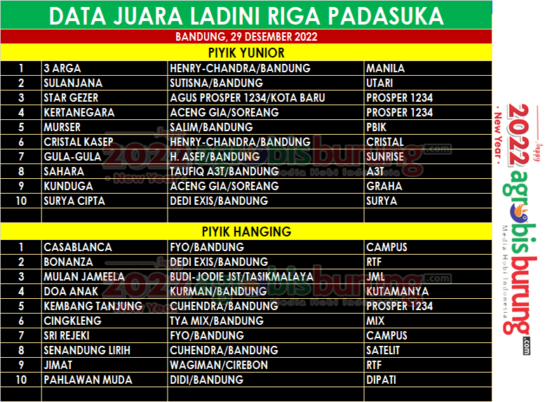 Meski tergolong latihan dinilai, namun semangat kungmania begitu luar biasa. Mereka membawa amunisi terbaiknya ke lapangan yang berada di kawasan Bandung Timur ini, Kamis (29/12/22). Henry Manila yang berkolaborasi bersama Chandra Bandung, membawa jagoan teranyarnya, yakni 3 Arga. Pada kesempatan kali ini burung bergelang Manila ini berhasil menjadi yang terbaim setelah tampil dominan. Henry-Chandra juga berhasil menempatkan jagoan anyar lainnya, yakni Cristal Kasep (Cristal) dipodium keenam.