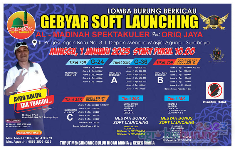SURABAYA, agrobisburung.com – H Dodot leader Oriq DPC Surabaya Raya bikin gebrakan di blok barat wilayah Surabaya pada Minggu (01/01) dengan gelaran berlabel Soft Lounching Gantangan Spektakuler Almadinah yang lokasinya tepat di seberang Menara Masjid Agung Al-Akbar Surabaya. Di acara soft lounching ini H Dodot yang sudah mendapat mandat dari Abah Roy Almadinah mengatakan responnya memang luar biasa, beberapa pemain yang biasa ngantang di Panjang Jiwo ikutan merapat bahkan peserta baru di sekitar wilayah Almadinah justru banyak yang merapat. “Saya optimis bisa menaklukan barat di Gantangan Spekatakuler Alamdinah yang konsep main dan penilaiannya khas Oriq dan ini terlihat di pemain love bird yang memang banyak pemain baru diluar komunitas Oriq Gantangan Panjang Jiwo. Mohon doa restunya.