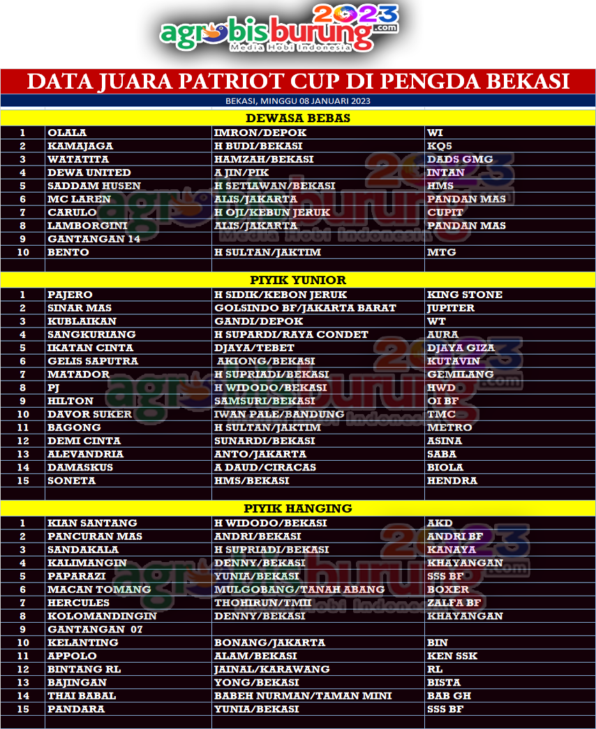BEKASI, agrobisburung.com – Gelaran Patriot Cup 2023 di Lapangan Kyathvin Bekasi pada Minggu (08/01) menjadi ajang yang menarik untuk kungmania di seputaran Bekasi untuk meramaikan jadwal perdana kungmania di awal tahun 2023. Apalagi debutan debutan baru jago lomba kungmania di seputaran Jabodetabek untuk persiapan musim konkurs 2023 memang sudah waktunya di tampilkan ke lapangan, lihat saja bagaimana tampilan Olala bergelng WI Milik Imron Bekasi yang memang sudah mulai di kondisikan turun lapangan mampu memberikan kesan joss buat tuannya. Olala tampil gemilang mengungguli Kamajaga bergelang KQ5 dan Watattta bergelang DADS GMG yang harus puas di posisi kedua dan ketiga.