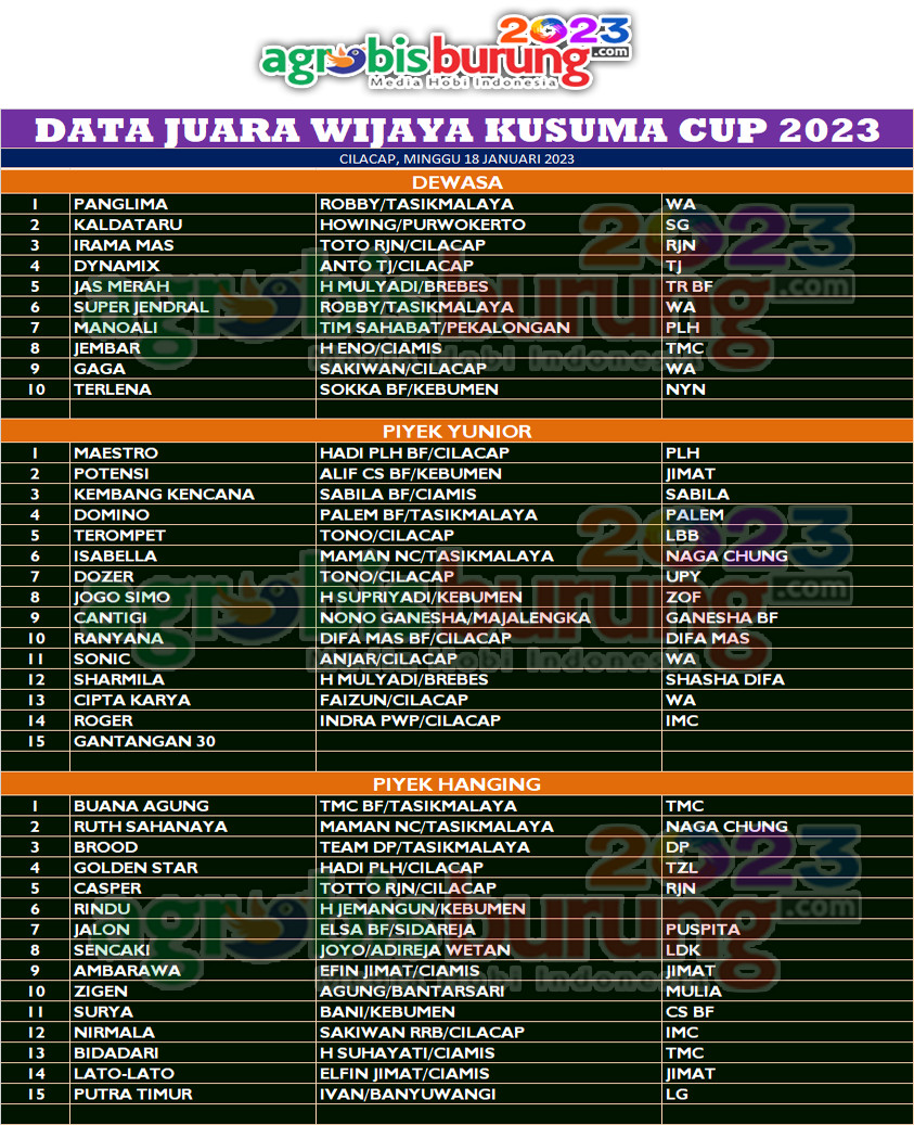 CILACAP, agrobisburung.com – Pengda Cilacap di awal tahun 2023 langsung mengebrak dengan menggelar Wijaya Kusuma Cup 2023 pada Minggu (15/01) di Cilacap dan gelaran ini mendapatkan dukungan dari kungmania Jawa Tengah yang nampaknya semakin kompak untuk mendukung semaraknya hobi perkutut di daerah daerah.