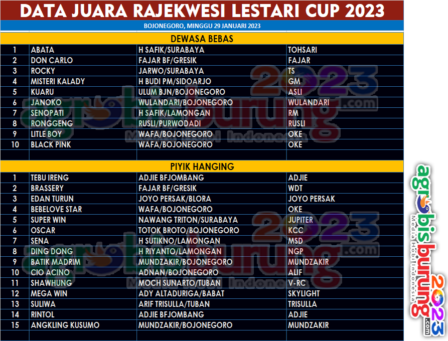 Di dewasa bebas, Abata bergelang Tohsari milik H Safik Surabaya yang tandang ke Bojonegoro mampu meraih kemenangan mutlask setelah melibas lawan lawannya. Don Carlo bergelang Fajar dan Rocky bergelang TS yang juga tampil menawan harus puas diposisi kedua dan ketiga.