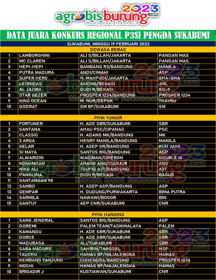 SUKABUMI, Agrobisburung.Com – Konkurs regional di lapangan Lembur Sawah Sukabumi, Minggu (19/2), diawali dengan penyerahan SK dari ketua Pengwil Jawa Barat H. Asep ASP kepada ketua Pengda Sukabumi H. Herman PJ, sebagai simbol resminya kepengurusan baru P3SI Pengda Sukabumi periode 2022-2027. Lomba berlangsung meriahh. Selain dihadiri peserta seputar Jabar juga hadir perwakilan dari Jabodetabek. Burung yang tampil pun termasuk kategori kelas berat yang memililki segudang pengalaman juara.