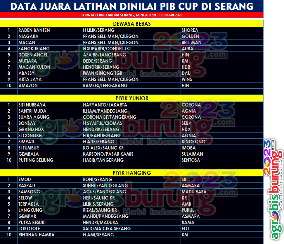 SERANG, agrobisburung.com – Agenda latihan dinilai mulai digulirkan lagi di Lap. Bird Arene Tornado BF di Serang pada Minggu (19/02) dengan label PIB Cup 2023 yang diserbu kungmania seputaran Banten dan sekitarnya. Antusia kungmania yang hadir juga sangat bagus dan tentunya ini juga menambah semangat dan semaraknya hobi perkutut di Banten Tangerang, apalagi jago jago yang turun merupakan wajah wajah baru yang ke depannya bakal melenggangh ke level yang lebih tinggi. Joko, panitia mengatakan bahwa latber di Serang kembali digulirkan dan jadwal ini akan di putar memakai lap. bird arena Tornado BF dan alhamdulilah tuan rumah H Lilik membuka pintu untuk kegiatan meramaikan hobi perkutut di Serang Banten.