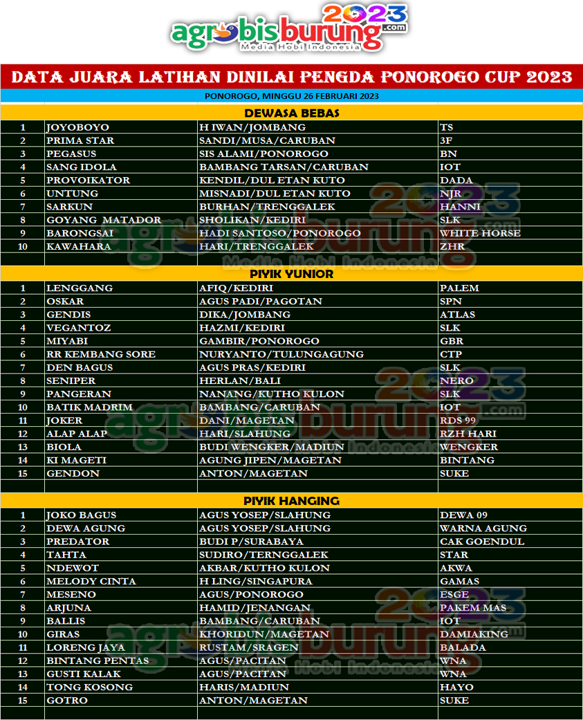 Di kelas piyik yunior, Lenggang bergelang Palem milik Afiq Kediri mampu tampil elegan di kelasnya, tampil dengan kemampuan terbaiknya Lenggang bisa mengatasi perlawanan sengit Oskar bergelang SPN dan Gendis bergelang Atlas yang harus puas di posisi kedua dan ketiga di akhir persaingan sengitnya. Dan di kelas piyik hanging yang jadi terbaik pertama adalah JOko Bagus bergelang Dewa -09 milik Agus Yosep dari Slahung. AB-END