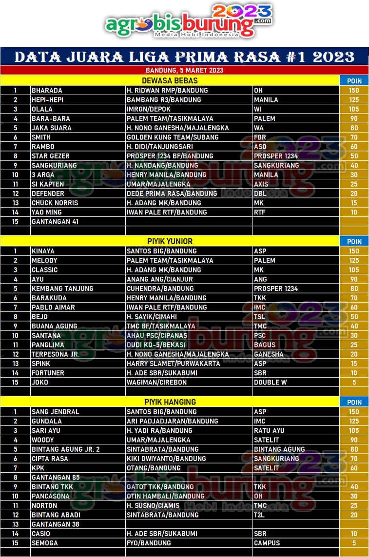 Moncernya Kinaya dan Sang Jendral menegaskan kapasitas ASP Bird Farm Cianjur sebagai salah satu peternak mapan yang konsisten mencetak generasi juara. Memasuki musim konkurs 2023, sejumlah produk ASP terus bermunculan dan ekais dijalur podium. Setelah dua kakak-beradik ASP C.01 (TL 444 x ASP C.8): Halilintar-Tornado menjajal blok Timur, kini produk dari kandang lainnya moncer di blok Barat. Yakni, Sang Jendral (SJ) > ASP C.15 (PDKT x Palem SK.19) dan Kinaya > ASP B.7 (ASP C.10 x ASP C.8).