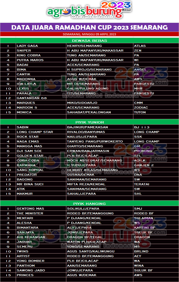 Di kelas piyik yunior jawara muda Sabin bergelang BJ milik Bajinur Pamekasan melenggang dari hadangan dua jawara seterunya untuk merebut posisi pertama. Long Champ Star bergelang Long Champ dan Rock Star bergelang SSK yang sempat menhadang Sabin harus puas di posisi kedua dan ketiga. Dan di kelas piyik hanging yang jadi terbaik pertama adalaha jawara belia Gentong Mas bergelang SMJ milik Solikul Jepara. AB-EDO/end