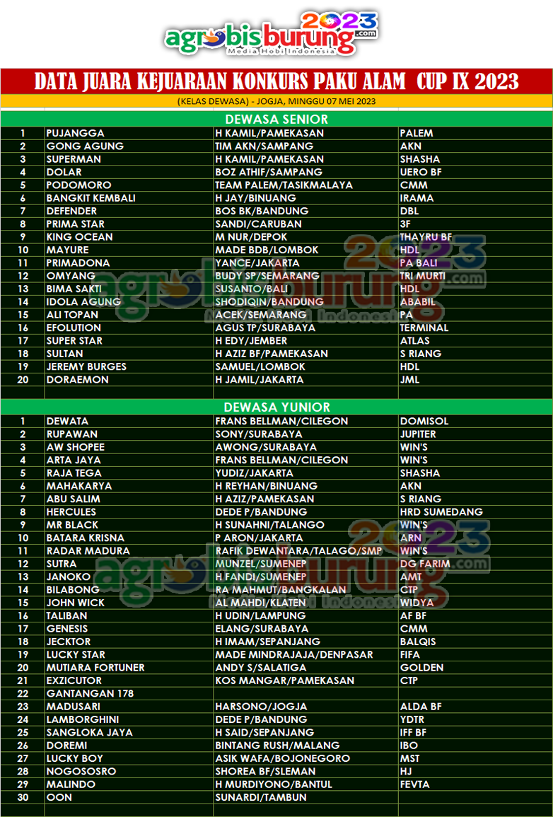 JOGJA, agrobisburung.com – Data Juara LPI Paku Alam IX Cup 2023 di Jogja, Minggu 07 Mei