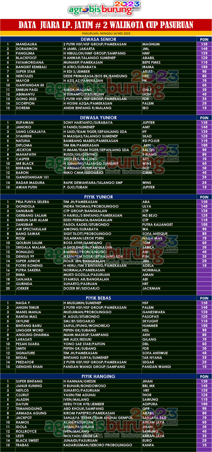Headline Hobi Burung Juara Organizer Perkutut Perkutut Profil Tokoh Data Juara LP. Jatim # 2 Walikota Cup 2023 di Pasuruan, Minggu 14 Mei agrobisburung 14 Mei 2023 PASURUAN, agrobisburung.com – Data Juara LP. Jatim # 2 Walikota Cup 2023 di Pasuruan, Minggu 14 Mei Tinggalkan Komentar Post navigation Previous: Adik Hercules Digondol H. Iwan I-One Majalengka, Amunisi Jarwo Team Siap Bersaing di LPI #4 Siliwangi Cup BandungNext: Superman mewah, Seruling Sakti & Siliwangi tampil Joss di Ladini Halal Bihalal Shasha DIfa di Jakarta More Stories Headline Perkutut Profil Golsindo BF Jakarta Rilis Formasi Kandang 2026, Andalkan Materi Indukan Terbaik, Siap Cetak Perkutut Kualitas Lomba dengan Bobot Suara Istimewa agrobisburung 14 Januari 2026 Headline Perkutut Profil Nunu Depok “Turun Gunung” Langsung Borong 5 Pasang K-Unggulan WAT BF Tasikmalaya, H. Pendi Nadira Jakarta Jebol K-WAT Brahmana & BDB BF Lombok Jebol K-WAT Raja Ampat agrobisburung 13 Januari 2026 Headline Juara Perkutut Jawara Bandar Jawa 1, Boxer & Joko Tarub Melejit ke Podium Utama Di Latihan Dinilai Pengcam Pengantenan Pamekasan agrobisburung 12 Januari 2026