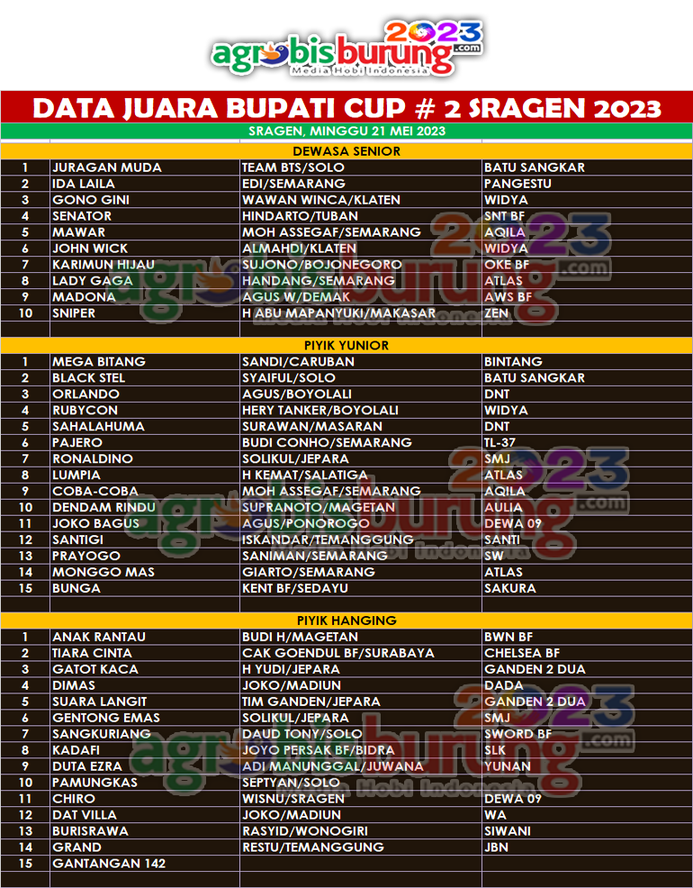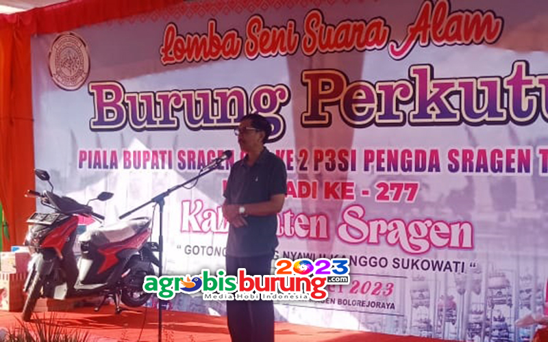 SRAGEN, agrobisburung.com – Gelaran Bupati Cup # 2 tahun 2023 kembali digulirkan pada Minggu (21/05) di kota Sragen dan gelaran tahun ke-2 ini sukses besar berkat dukungan langsung Bupati Sragen, Dr. Kusdinar Untung Yuni Sukowati. Hadir dalam kesempatan yang sama pejabat Kab. Sragen dan pengurus pengwil Jateng yang ikut meramaikan kegiatan yang akan dijadikan agenda tahunan Kabupaten Sragen.