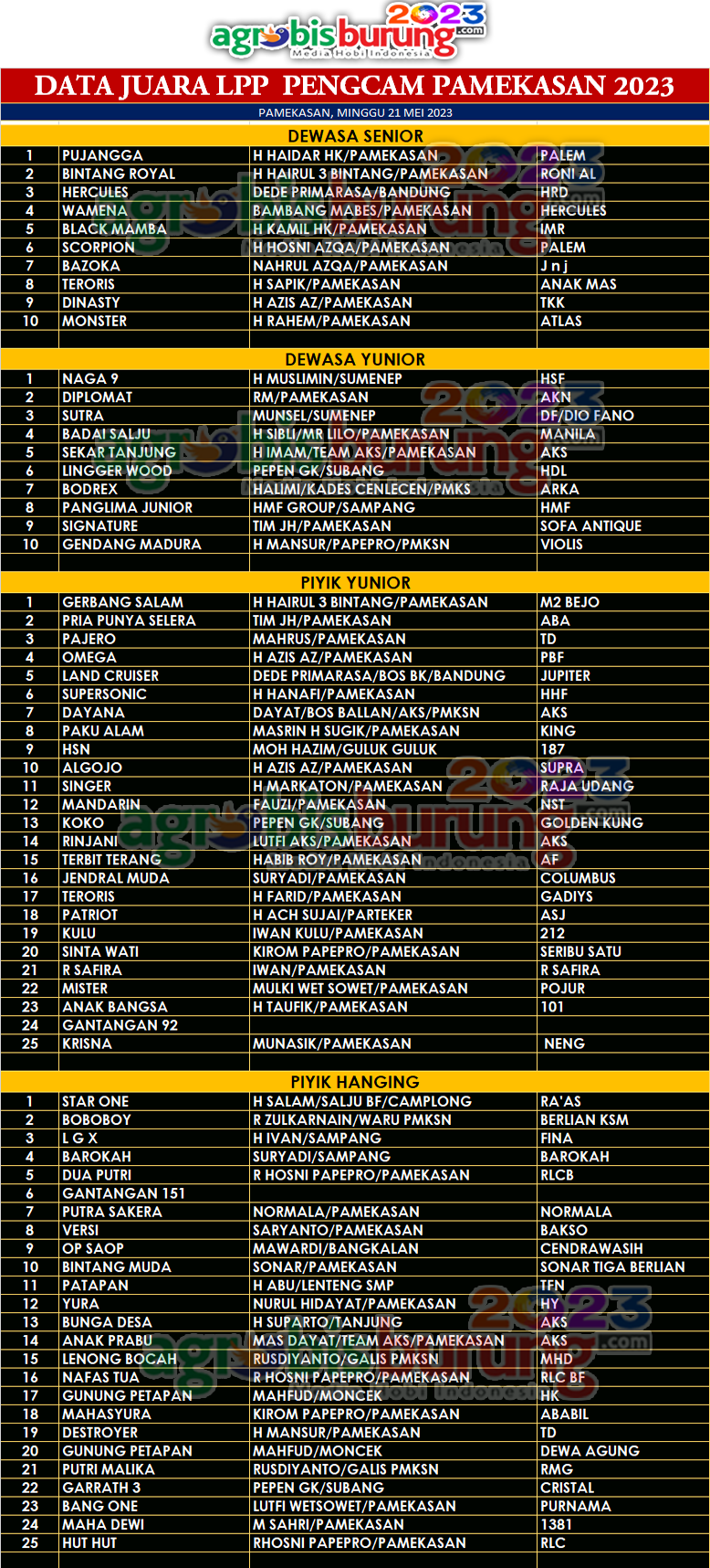Di kelas dewasa yunior, Naga 9 bergelang HSF Pamekasan milik H Muslimin tampil agresif, setelah moncer di LPJT sepekan lalu peformnya masih bisa dipertahankan untuk merebut podium pertama di LPP 2023. Diplomat bergelang AKN dan Sutra bergelang DF/Dio Fanao yang sempat mengandengnya harus bertengger di posisi kedua dan ketiga.