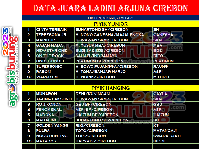 Minggu (21/5/23), Cinta Terbaik kembali menunjukkan kemampuannya di gelaran Ladini di lapang Arjuna Cirebon. Cinta Terbaik berhasil mempertahankan tahtanya diposisi puncak kelas piyik yunior. Kali ini Cinta Terbaik tampil apik dan stabil sejak babak awal hingga akhir. Burung bergelang SH ini sukses mengatasi perlawanan Terpesona Junior (Ganesha) dan Mario Junior (SKM), dua pesaing utamanya di kelas kerekan setengah tiang.